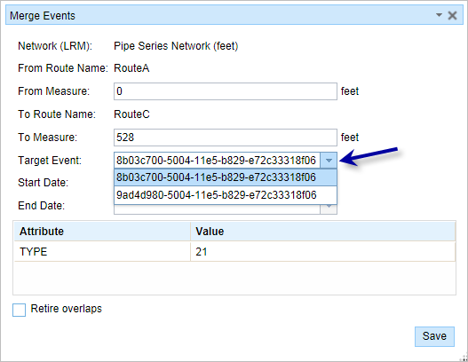 Upon successful execution, the Merge Events tool merges multiple adjoining events into an existing target event. All the input events, except the target event, retire. The merged event acquires the lowest value from the From Measure field and highest value of the To Measure field from the input events by default. If a gap exists between the input events, the gap is bridged in the merged event. You can edit the attributes of the merged layer prior to committing the merge.